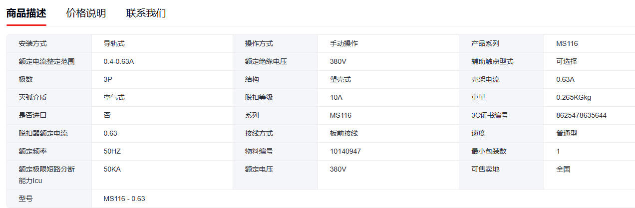 供应MS116 - 0.63 调整范围0.4-0.63A 电动机保护断路器 货号10140947 1只