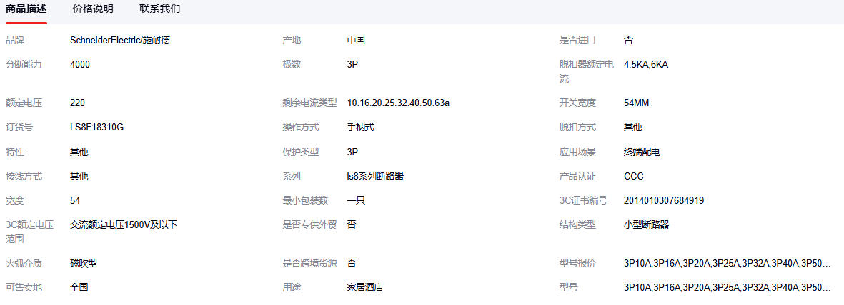 施耐德3P断路器 施耐德ls8系列C10A16A空气开关