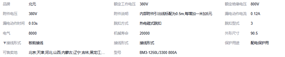 北 京北元BM3-1250L/3300 800A 塑壳漏电断路器 BM3L系列 50/60hz