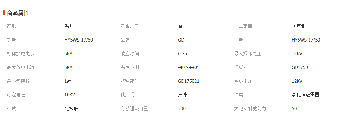 广大高压氧化锌避雷器HY5WS-17/50户外10KV交流金属跌落式避雷器