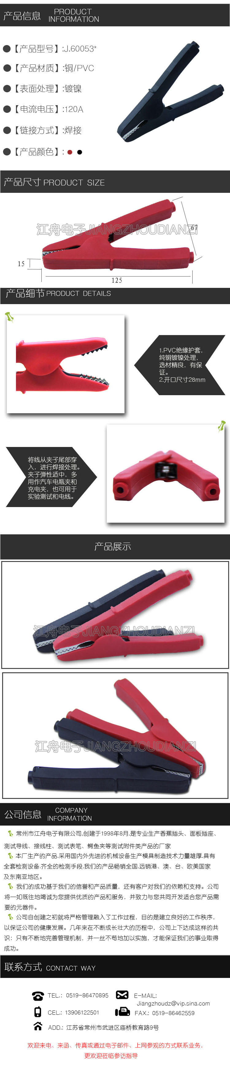 常州奕蓉华电子J.60053型号 鳄鱼夹测试电线电源夹