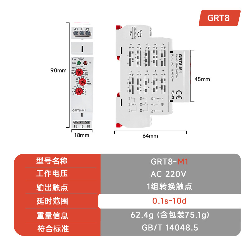 GEYA格亚 GRT8-M多功能时间继电器选择触发延时通断电DC 24V控制器
