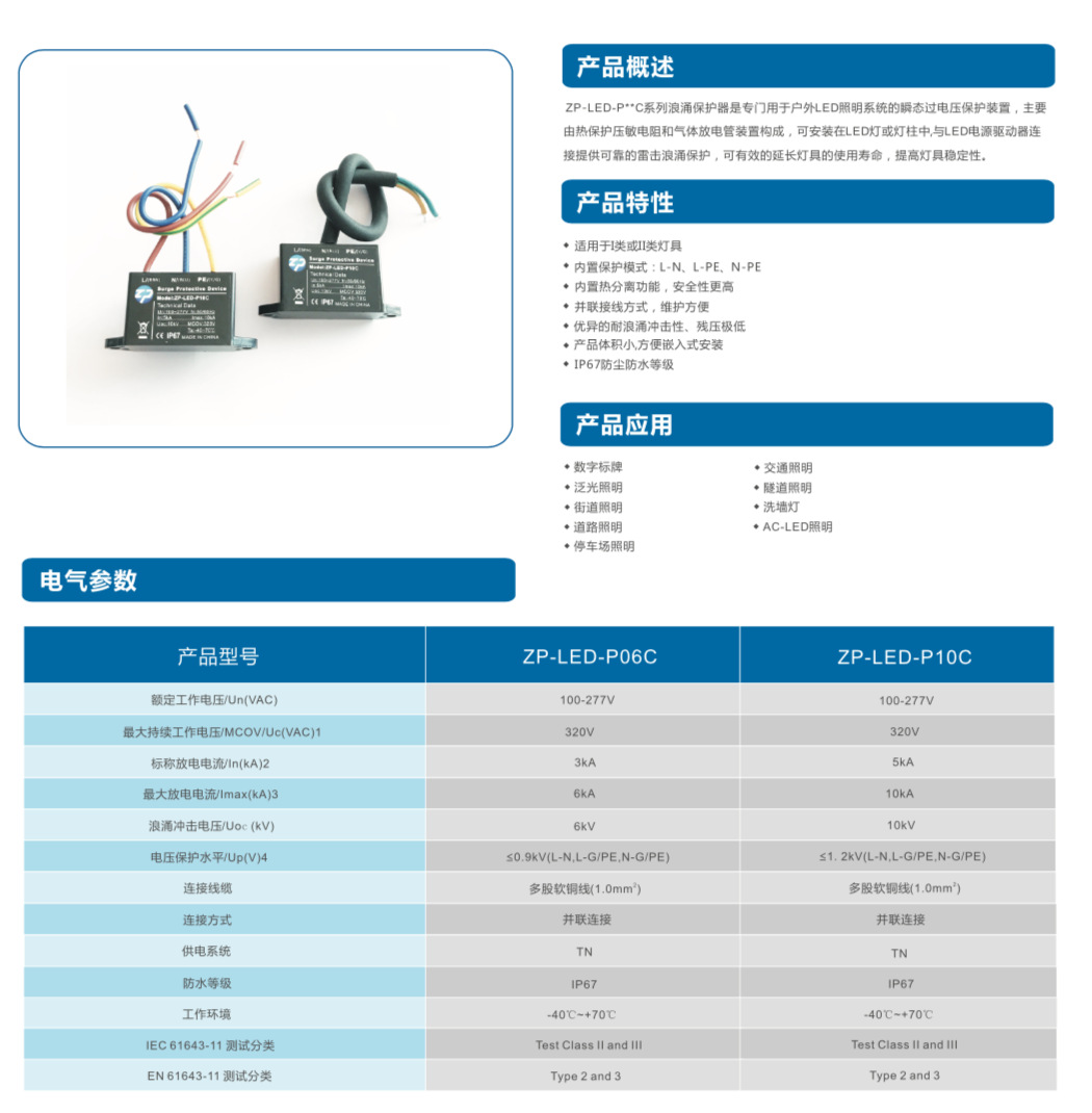 ZP-LED series products are our company specially designed for the LED outdoor lighting system design of the whole series of power surge protection products, the product can be installed in the lamp shade of the LED or control cabinet. LED street lamps, tunnel lights, outdoor landscape lights, outdoor lighting systems, protection of LED outdoor lighting power supply system from lightning damage.