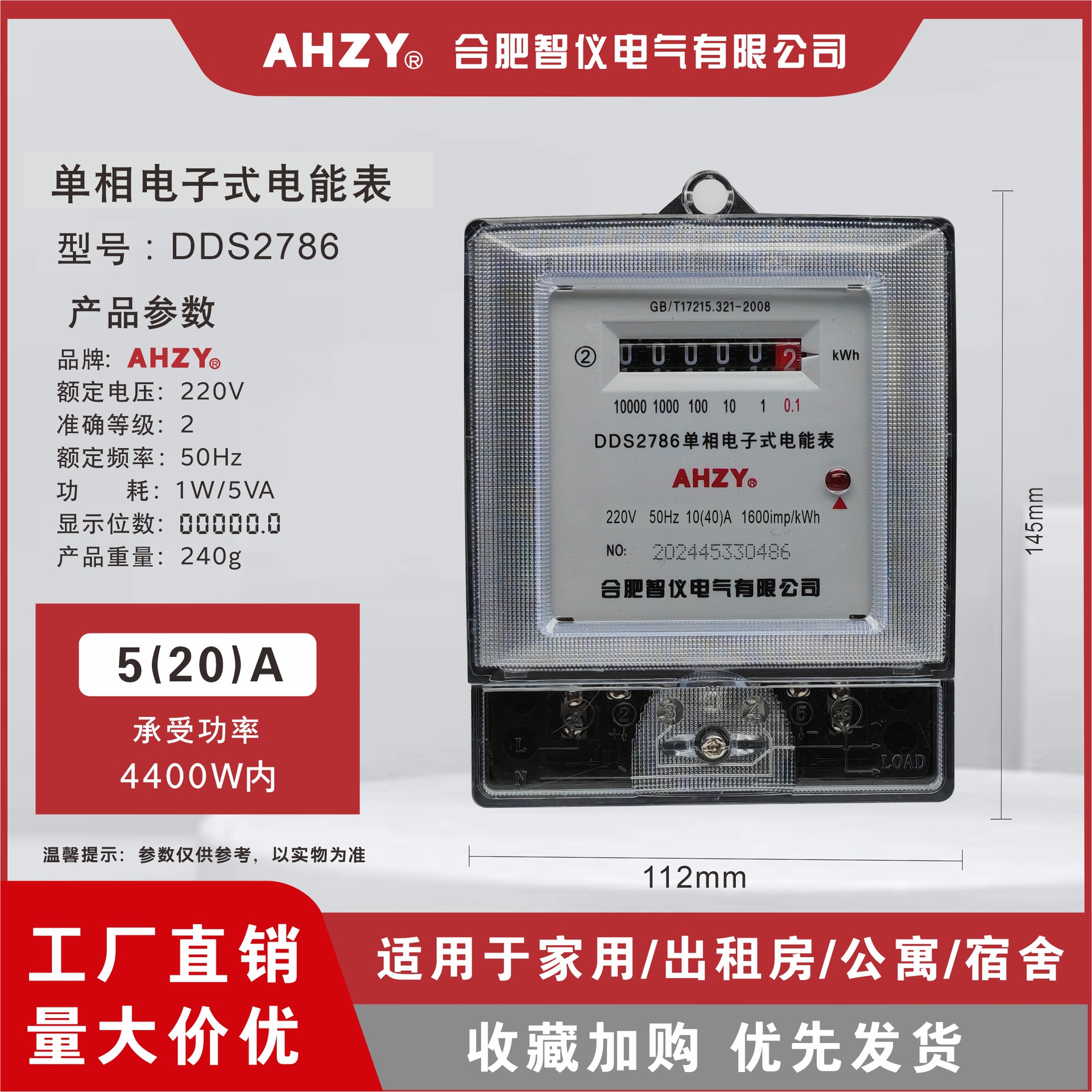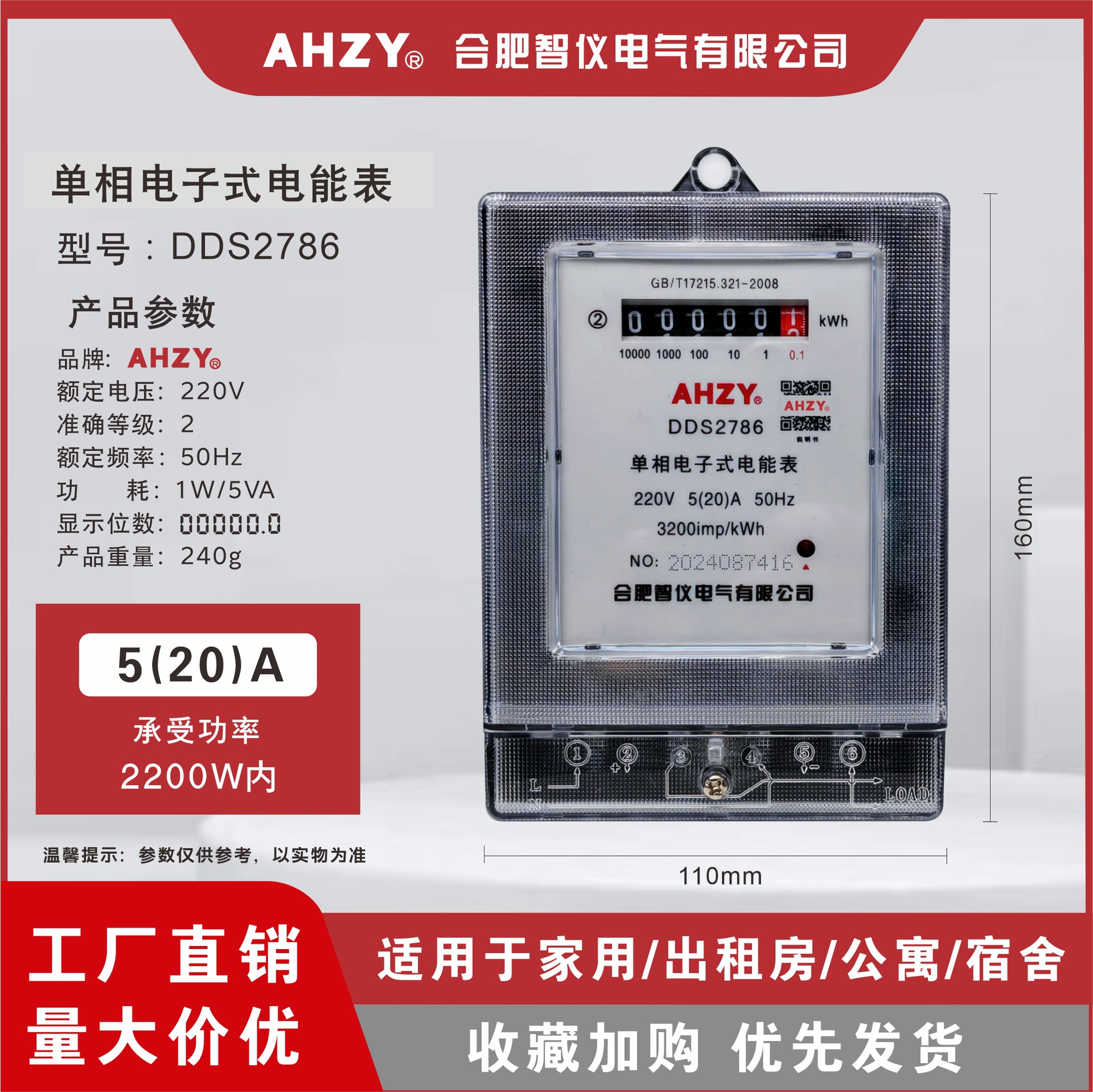 AHZY单相电子式电能表出租房家用220v公寓电表空调计度器高精度