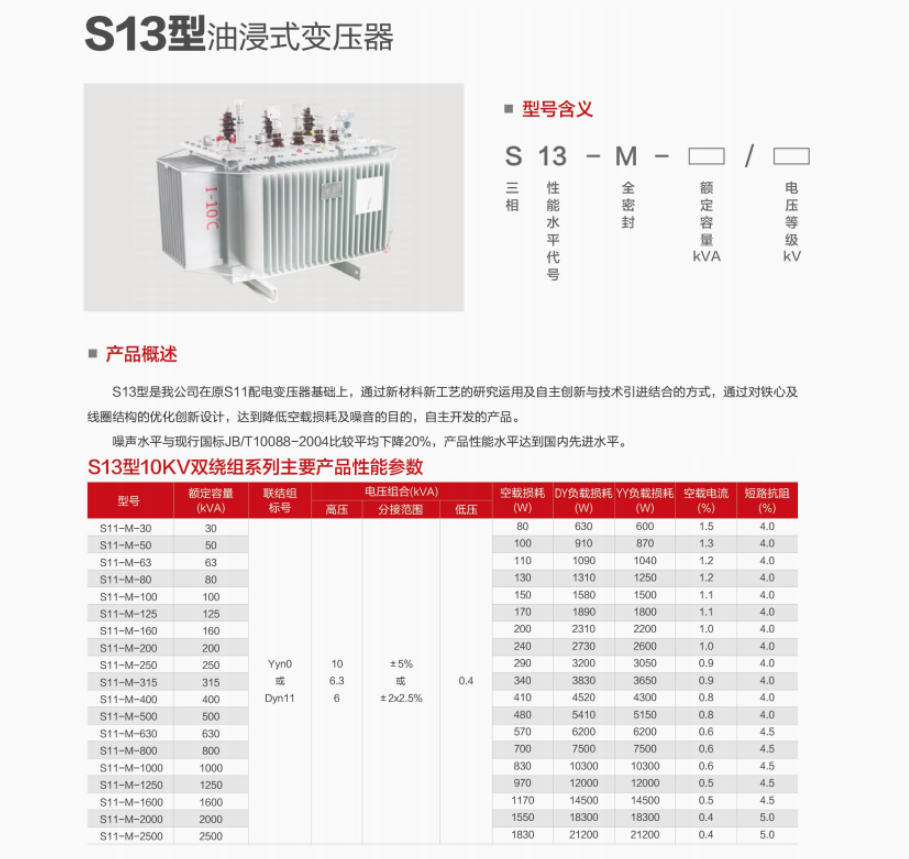 S13型是我公司在原S11配电变压器基础上,通过新材料新工艺的研究运用及自主创新与技术引进结合的方式,通过对铁心及线圈结构的优化创新设计,达到降低空载损耗及噪音的目的,自主开发的产品。