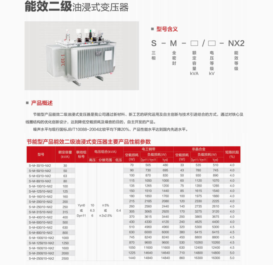 节能型产品能效二级油浸式变压器是我公司通过新材料、新工艺的研究运用及自主创新与技术引进结合的方式,通过对铁心及线圈结构的优化创新设计,达到降低空载损耗及噪音的目的,自主开发的产品。