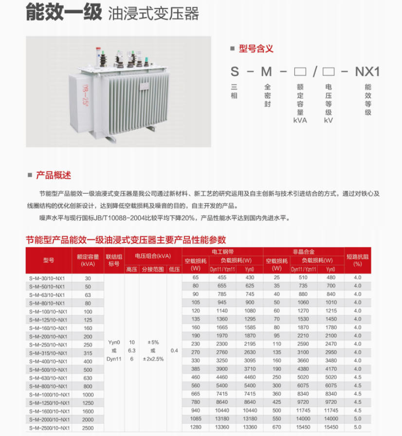 节能型产品能效一级油漫式变压器是我公司通过新材料、新工艺的研究运用及自主创新与技术引进结合的方式,通过对铁心及线圈结构的优化创新设计,达到降低空载损耗及噪音的目的,自主开发的产品。