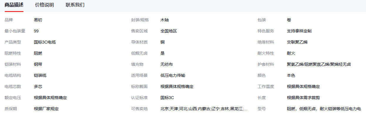 易初品牌阻燃低烟无卤耐火铠装国标3C电力电缆 (面议)