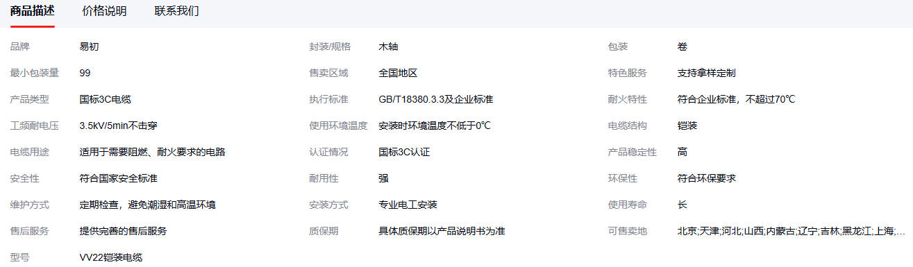 易初品牌VV22铠装电缆 国标3C认证 木质轴包装 (面议)