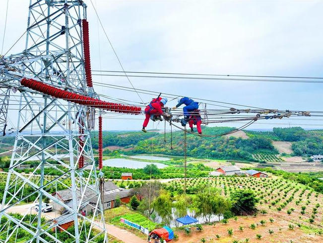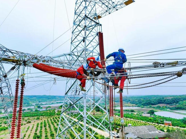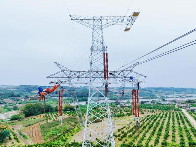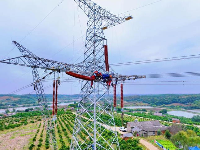 在湖北省当阳市半月镇,国网湖北超高压公司荆门运维分部开展500千伏葛军线抗冰改造项目。